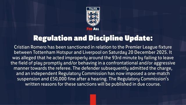 罗梅罗因2025年12月20日(周六)托特纳姆热刺对阵利物浦的英超赛事,遭到纪律处罚。